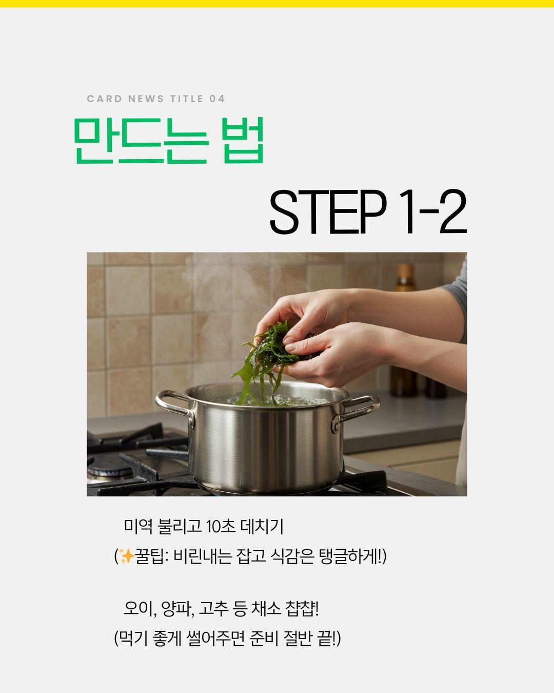 - 꿀팁! 미역을 살짝 데치면 비린 맛은 사라지고, 오독오독한 식감은 더욱 살아납니다.