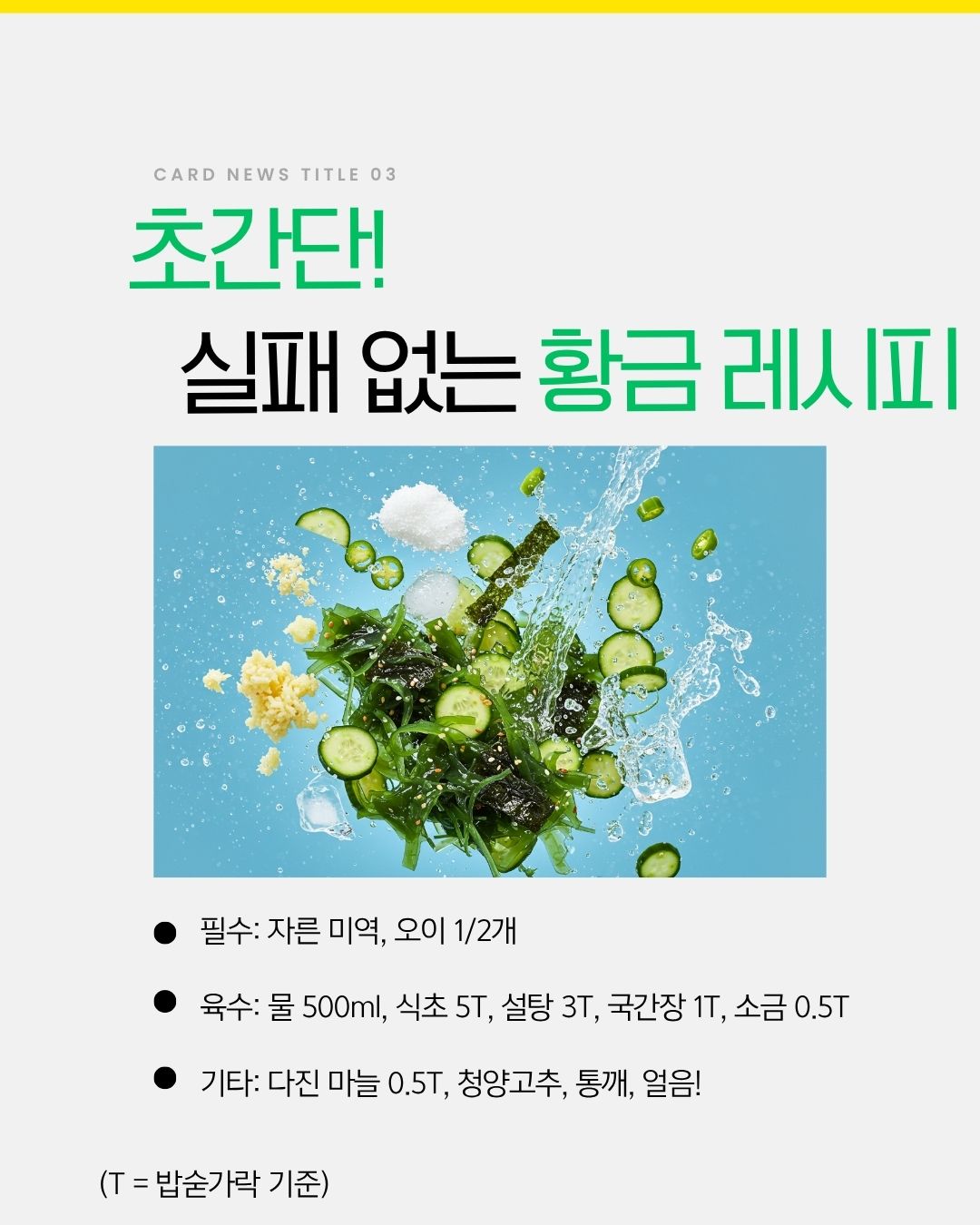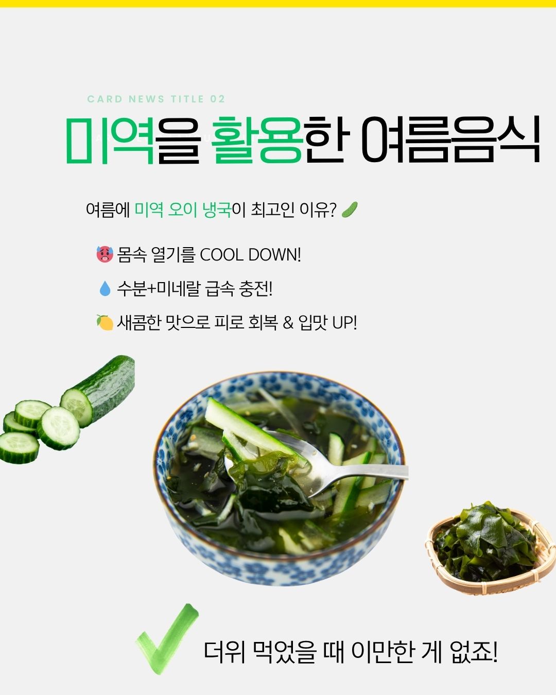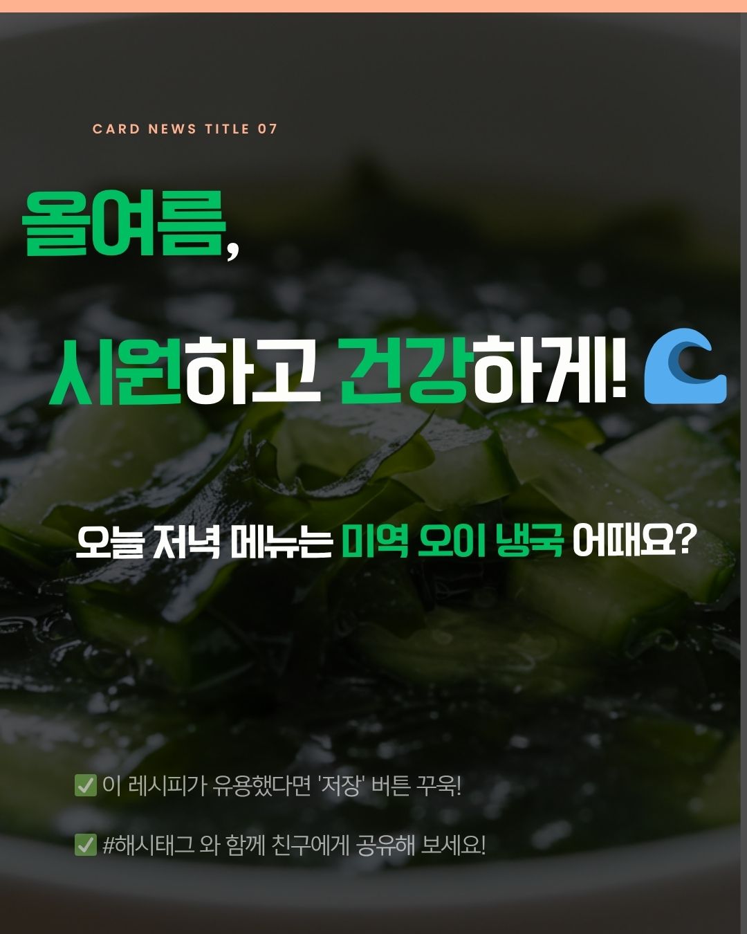 오늘 저녁, 온 가족이 함께 즐길 수 있는 시원하고 건강한 미역 오이 냉국 한 그릇 어떠신가요? 올여름, 바다가 선물한 보약 '미역'으로 입맛과 건강, 두 마리 토끼를 모두 잡으시길 바랍니다!